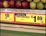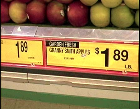 two buns (39 cents), one lump of liverwurst ($1.39), two apples ($1.89 a pound) and some minute maid lemonade stuff (89 cents).