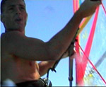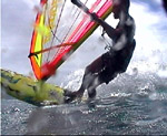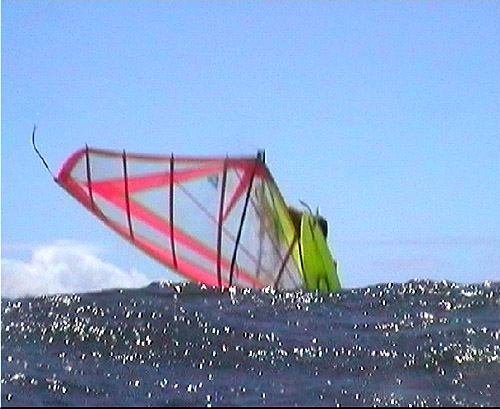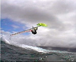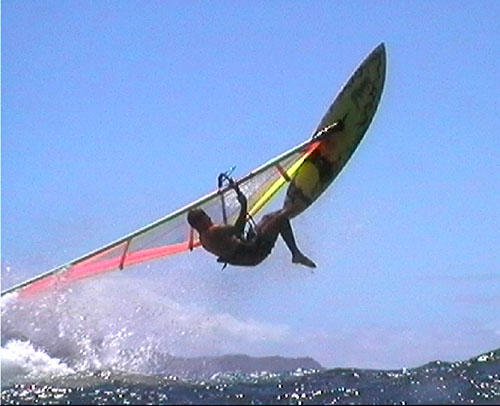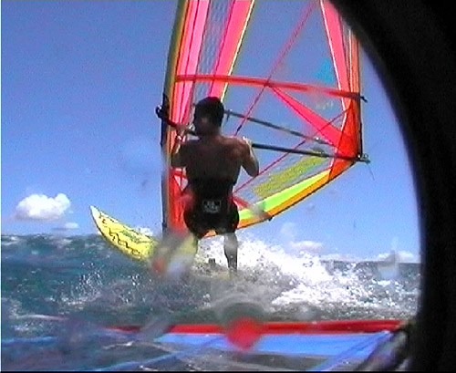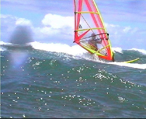 krause lines up his next ramp - takes it for some monster air, gybes onto the next set and gets ready to go down the line - all in a days work for the boy with the $ 1600 broken board and 6 year old sails...