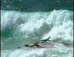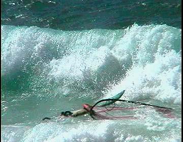 at first glance you may think - so what somebody bailed in a jump and their gear is in the waves. think again - this is shorebreak - and the girl's gear got washed onto the rocks out of her hands when she was launching